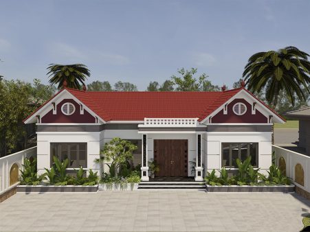 Vẻ đẹp và ngoại thất của mẫu thiết kế nhà cấp 4 đẹp Mẫu thiết kế nhà cấp 4 mang phong cách hiện đại với kiểu mái thái, kết hợp với hệ thống hiên và sân vườn truyền thống để tạo cảm giác thân quen và gần gũi. Các đường phào, gờ chỉ được lựa chọn với sống lượn vừa phải và phù hợp với từng vị trí, quán triệt phương châm đơn giản, đúng, đủ và đẹp.